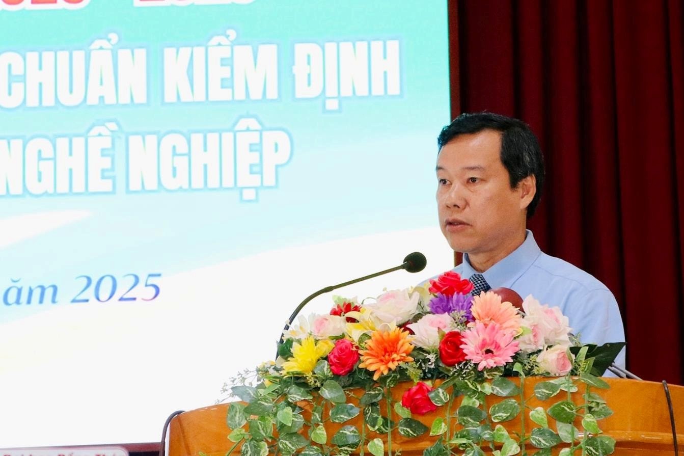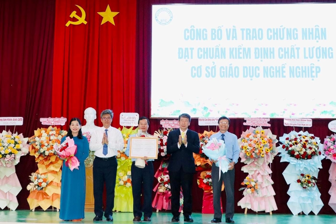 Tại buổi lễ, GS. TS. Phạm Tiết Khánh – Chủ tịch Hiệp hội Cao đẳng Cộng đồng Việt Nam đã đại diện Trung tâm Kiểm định CATD lên trao Giấy Chứng nhận đạt tiêu chuẩn kiểm định chất lượng cơ sở giáo dục nghề nghiệp cho Ban giám hiệu nhà trường. Ông gửi lời chúc mừng những thành quả mà tập thể nhà trường đã đạt được trong thời gian qua, đặc biệt là việc nhận Giấy chứng nhận đạt tiêu chuẩn kiểm định chất lượng cơ sở giáo dục nghề nghiệp. Trong buổi gặp gỡ, ông đã có những chia sẻ đầy tâm huyết, truyền cảm hứng và động lực đến toàn thể đội ngũ cán bộ quản lý, nhà giáo, viên chức và người lao động của nhà trường, khích lệ tinh thần yêu nghề, cống hiến cho sự nghiệp trồng người và xây dựng niềm tin về chất lượng cho người học cũng như cộng đồng.